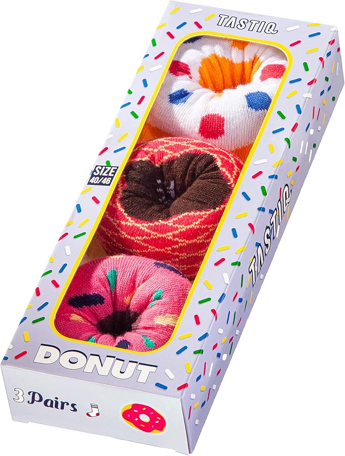TASTIQ UNISEX SOCKEN DONUTS SOCKS 3-PACK bringen mit ihrem verspielten Donut-Design Farbe und Spaß in deinen Alltag. Das weiche, elastische Material sorgt für einen angenehmen Sitz und hohen Tragekomfort. Perfekt für Freizeit, Büro oder als stylischer Hingucker zu jedem Outfit.